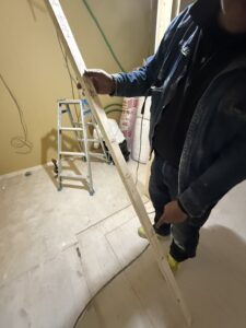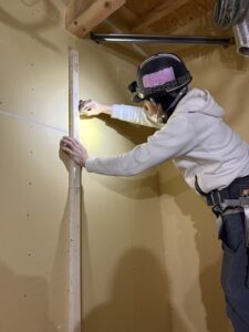 壁に墨出しをしているドゥックさんが使用している角材は、BIGな社長が毎現場ごとに制作している寸法棒と呼ばれるものだそうです。